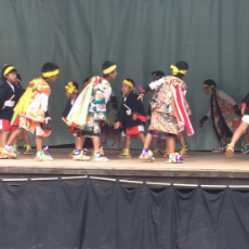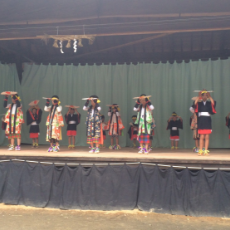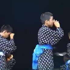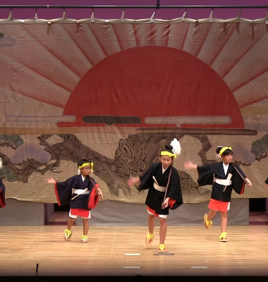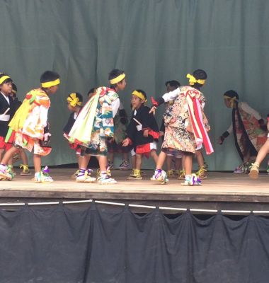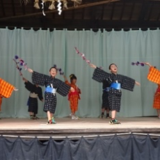 踊りは各地区ごとに、演題に合わせた小道具を持った踊り、何も持たない手踊り、日の丸扇を持った扇踊りなどを披露します。なかには舞台上で無邪気に動き回り、途中で泣き出す小さな子などもいますが、観衆はそれも子踊りに付き物の余興として、その可愛らしい様子を楽しみます。
